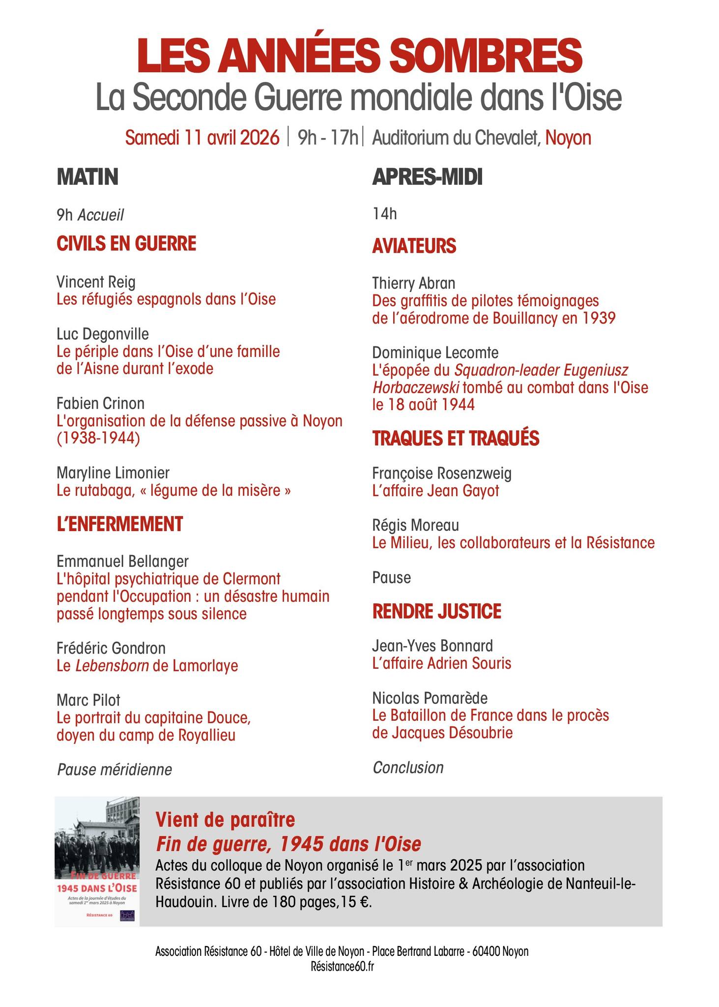 samedi 11 avril 2026, de 9h à 17h, à l'auditorium du Chevalet à Noyon, pour sa journée d’études #2026 consacrée à la Seconde Guerre mondiale dans l’Oise, intitulée «