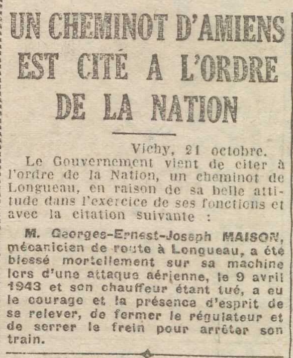 M. Georges-Ernest-Joseph MAISON, mécanicien de route à Longueau, a été blessé mortellement sur sa machine, lors d'une attaque aérienne, le 9 avril 1943, et son chauffeur étant tué, a eu le courage et la présence d'esprit de se relever, de fermer le régulateur et de serrer le frein pour arrêter son train.
