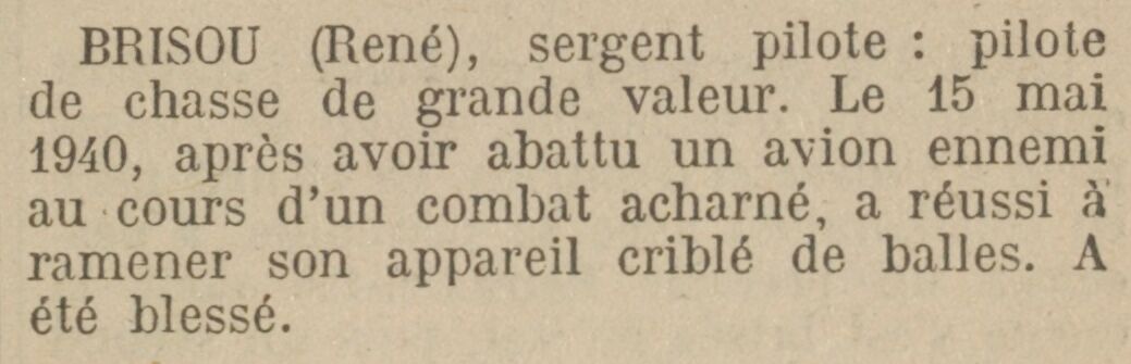 Bonjour. Voici une série de photos du Bloch 152 n° 172 piloté par le Sergent Brisou le 14 mai 1940. Suite à la demande du Groupement 21, une mission de protection est demandée entre 14 h 30 et 15 h 15 pour permettre à un Potez 63-11 du GR II/52 d'effectuer une mission de reconnaissance sur le secteur Dinant - Ciney. Les Bloch ont ordre de rester en arrière du Potez. Le GC II/1 fournit 2 patrouilles simples. Dès leur arrivée sur le secteur, les patrouilles se heurtent à une formation mixte d'une soixantaine de Messerschmitt 109 et 110. Le Sergent Brisou s'est laissé surprendre par l'évolution de sa patrouille qui a manœuvré très brusquement, et il s'en trouve séparé. Les chasseurs allemands l'attaquent sans relâche, mais il a réussi à en abattre un qui tombe en flammes. Faisant l'objet d'une attaque conjuguée de 3 Me 109 et 2 Me 110, il se pose en campagne (lieu du crash non identifié) train rentré, en panne moteur et à court de munition. Il est aussitôt mitraillé au sol et son avion est criblé de projectiles. Perdant son sang en abondance car il a été pratiquement scalpé soit par une balle, soit par son pare-brise, il est secouru par une ambulance voisine. Rejoignant son unité le surlendemain, il est très affecté par sa blessure et refuse de se faire évacuer. Il sera envoyé d'office en convalescence par son Commandant d'unité.