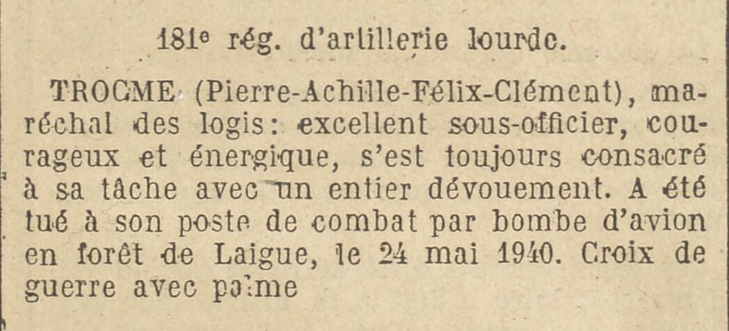 TROCMÉ (Pierre-Achille-Félix-Clément), maréchal des logis : excellent sous-officier, courageux et énergique, s'est toujours consacré à sa tâche avec un entier dévouement. A été tué à son poste de combat par bombe d'avion en forêt de Laigue, le 24 mai 1940. Croix de guerre avec palme