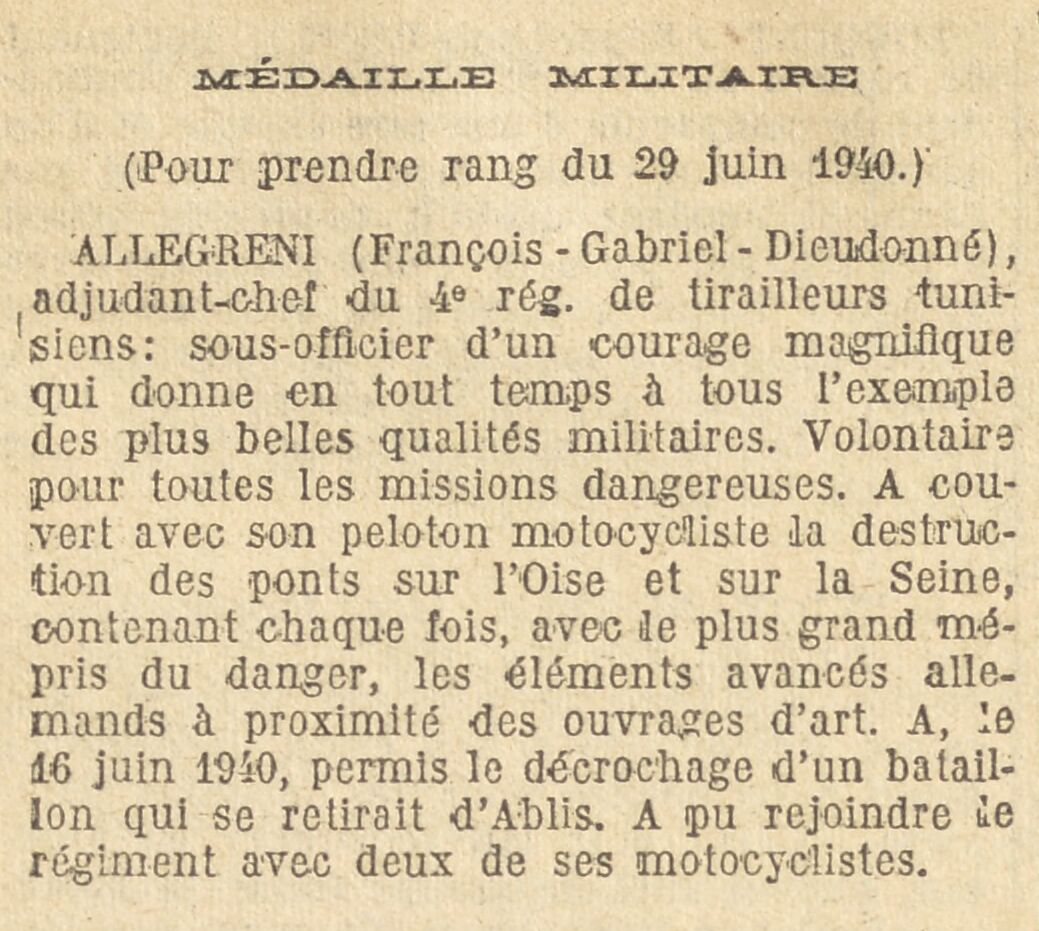 TONNAIRE (Nestor), capitaine au 4e régiment de tirailleurs tunisiens : officier de la plus grande valeur, obtenant de ses tirailleurs des actions d'éclat admirables. Le 11 juin 1940, à Chauffour, a organisé une base de feu sous un violent bombardement, encourageant ses tirailleurs par sa présence aux endroits les plus exposés. Le 16 juin, à Houville, s'est cramponné au terrain, arrêtant l'avance ennemie pendant plus de six heures. Tous ses chefs de section et son chef de groupe de mortiers étant mis hors de combat a lutté jusqu'à l'extrême limite, assurant lui-même le service de ses pièces jusqu'au dernier obus.