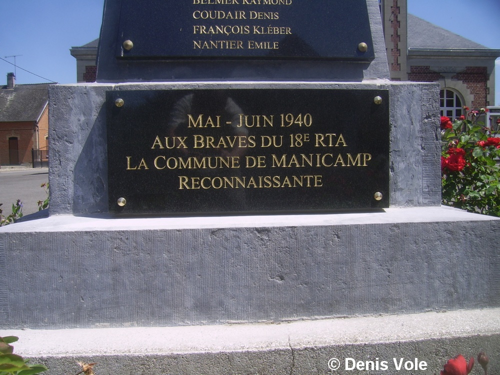 Deux photos du Monument aux Morts de Manicamp (Aisne) avec la plaque du 18e Régiment de Tirailleurs Algériens posée pour le 70e anniversaire des combats de 1940.
