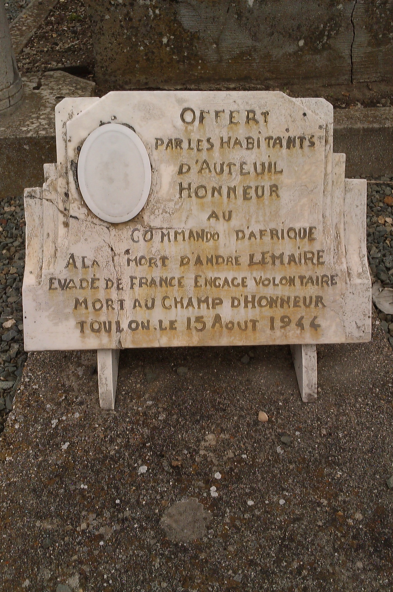 Mais l'un était posté sous le perron de l'entrée, résolu à mener une action désespérée. André s'avance, accompagné de civils heureux d'avoir été libérés du joug de l'occupant. Brusquement, le tireur allemand embusqué bondit de sa cachette et vide son chargeur sur le jeune soldat français qui, trois jours plus tard, aurait fêté ses 18 ans. Il fut l'une des premières victimes françaises de ce Débarquement de Provence. Dans son village d'Auteuil, une stèle rappelle le sacrifice d'André Lemaire. Lors de son inauguration le 30 septembre 2001, Jean Lecercle(*), président départemental des Combattants volontaires de la Résistance, avait suggéré aux élus de donner à l'école d'Auteuil le nom de André Lemaire. Plusieurs mois plus tard, cette proposition était rejetée par le conseil