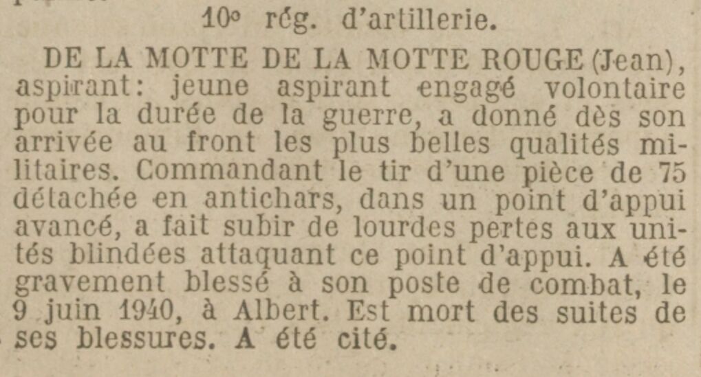 "L'infanterie s'est déjà repliée ; le temps presse ; il n'arrive qu'une partie des avant-trains. Les premiers chars ennemis paraissent. Le lieutenant de Courson donne toutes les voitures attelées à l'aspirant Muzard et le fait retraiter sur Vrély. L'Aspirant et toute sa colonne seront pris dans ce village : entourés de motocyclistes et d'auto-mitrailleuses, ils ne peuvent que se rendre. Le lieutenant de Courson fait partir à pied quelques hommes ; puis il retrouve des avant-trains, attelle de nouvelles voitures et part avec elles. Un caisson est atteint par un obus tiré par les chars ennemis et saute. C'est au cours de cette sortie de position que sont tués : le maréchal des logis chef Guénégo, le trompette Le Collen, l'ouvrier en bois Lefeuvre, les conducteurs Josse et Boscher, tous de la 9e batterie, et aussi le maréchal des logis Le Floch, de l'État-Major du Groupe, qui, à ses moments de liberté, était notre très dévoué aumônier. L'adjudant-chef Bibaud devait périr à Beaufort, quelques kilomètres plus loin. Guénégo était le meilleur de mes sous-officiers ; Le Collen était un soldat parfait."