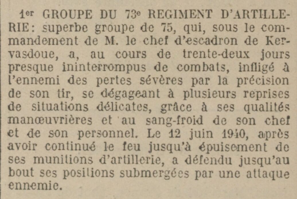 1er GROUPE DU 73e REGIMENT D'ARTILLERIE : superbe groupe de 75, qui, sous le commandement de M. le chef d'escadron de Kervasdoue, a, au cours de trente-deux jours presque ininterrompus de combats, infligé à l'ennemi des pertes sévères par la précision de son tir, se dégageant à plusieurs reprises de situations délicates, grâce à ses qualités manœuvrières et au sang-froid de son chef et de son personnel. Le 12 juin 1940, après avoir continué le feu jusqu'à épuisement de ses munitions d'artillerie, a défendu jusqu'au bout ses positions submergées par une attaque ennemie.