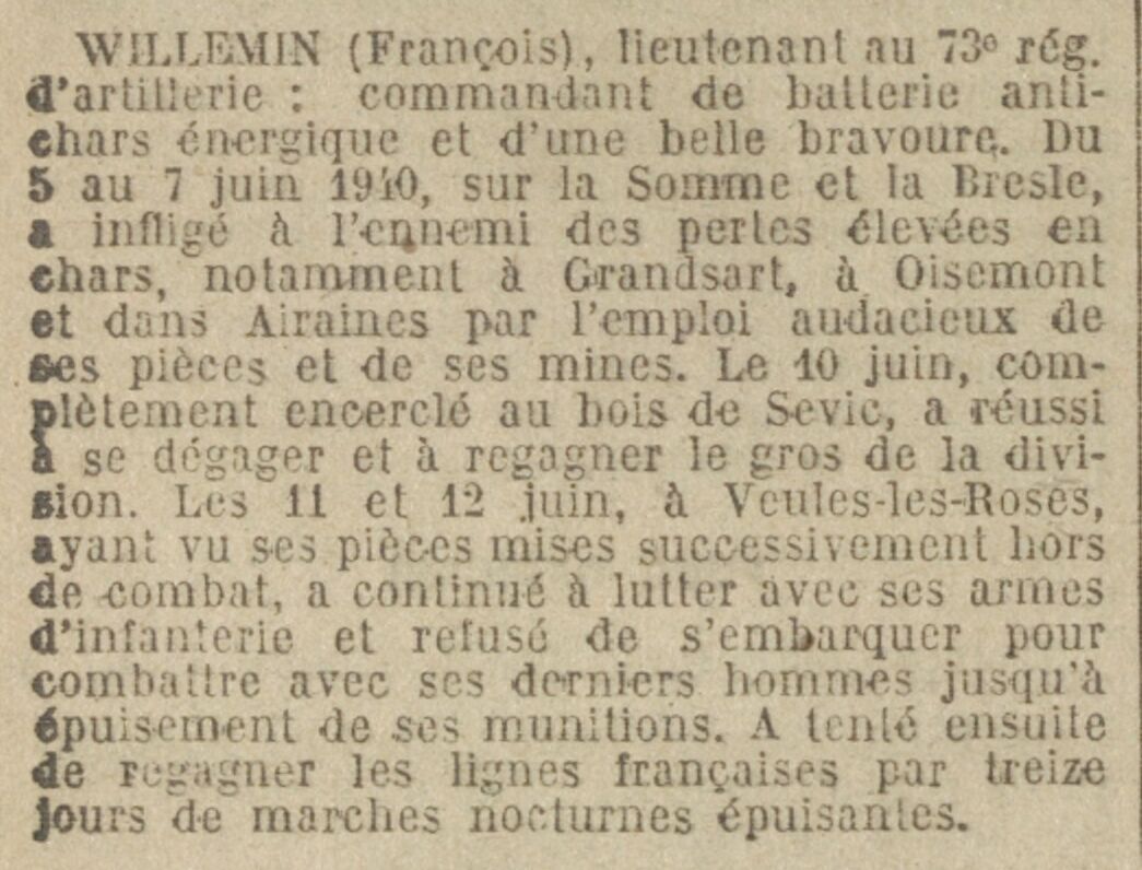 WILLEMIN (François), lieutenant au 73e régiment d'artillerie : commandant de batterie antichars énergique et d'une belle bravoure. Du 5 au 7 juin 1940, sur la Somme et la Bresle, a infligé à l'ennemi des pertes élevées en chars, notamment à Grandsart, à Oisemont et dans Airaines par l'emploi audacieux de ses pièces et de ses mines. Le 10 juin, complètement encerclé au bois de Sevic, a réussi se dégager et à regagner le gros de la division. Les 11 et 12 juin, à Veules-les-Roses, ayant vu ses pièces mises successivement hors de combat, a continué à lutter avec ses armes d'infanterie et refusé de s'embarquer pour combattre avec ses derniers hommes jusqu'à épuisement de ses munitions. A tenté ensuite de regagner les lignes françaises par treize jours de marches nocturnes épuisantes.