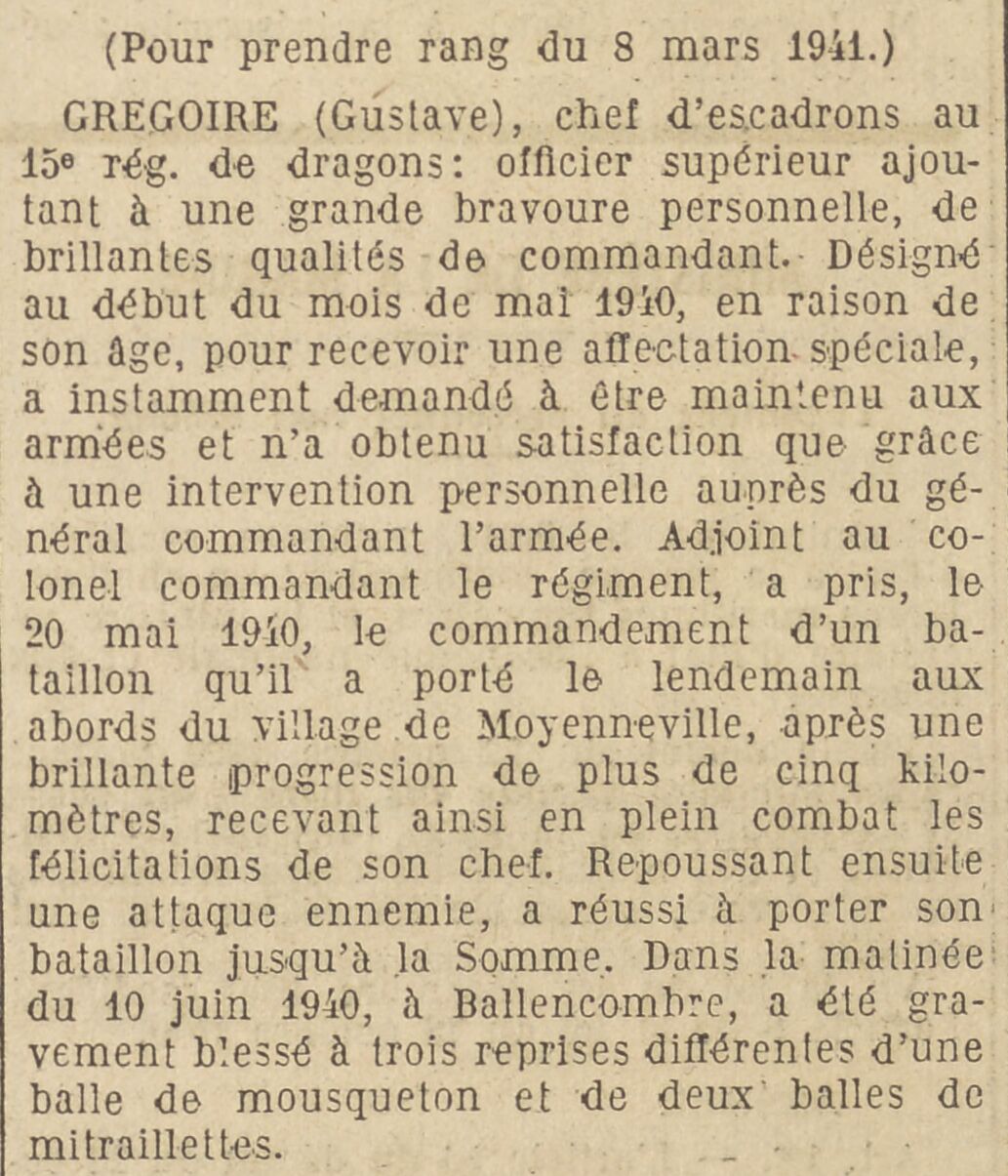GREGOIRE (Gustave), chef d'escadron au 15e régiment de dragons : officier supérieur ajoutant à une grande bravoure personnelle, de brillantes qualités de commandant. Désigné au début du mois de mai 1940, en raison de son âge, pour recevoir une affectation spéciale, a instamment demandé à être maintenu aux armées et n'a obtenu satisfaction que grâce à une intervention personnelle auprès du général commandant l'armée. Adjoint au colonel commandant le régiment, a pris, le 20 mai 1940, le commandement d'un bataillon qu'il a porté le lendemain aux abords du village de Moyenneville, après une brillante progression de plus de cinq kilomètres, recevant ainsi en plein combat les félicitations de son chef. Repoussant ensuite une attaque ennemie, a réussi à porter son bataillon jusqu'à la Somme. Dans la matinée du 10 juin 1940, à Bellencombre*, a été gravement blessé à trois reprises différentes d'une balle de mousqueton et de deux balles de mitraillettes.