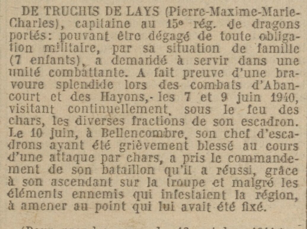 DE TRUCHIS DE LAYS (Pierre-Maxime-Marie-Charles), capitaine au 15e régiment de dragons portés : pouvant être dégagé de toute obligation militaire, par sa situation de famille (7 enfants), a demandé à servir dans une unité combattante. A fait preuve d'une bravoure splendide lors des combats d'Abancourt et des Hayons, les 7 et 9 juin 1940, visitant continuellement, sous le feu des chars, les diverses fractions de son escadron. Le 10 juin, à Bellencombre, son chef d'escadrons ayant été grièvement blessé au cours d'une attaque par chars, a pris le commandement de son bataillon qu'il a réussi, grâce à son ascendant sur la troupe et malgré les éléments ennemis qui infestaient la région, à amener au point qui lui avait été fixé.