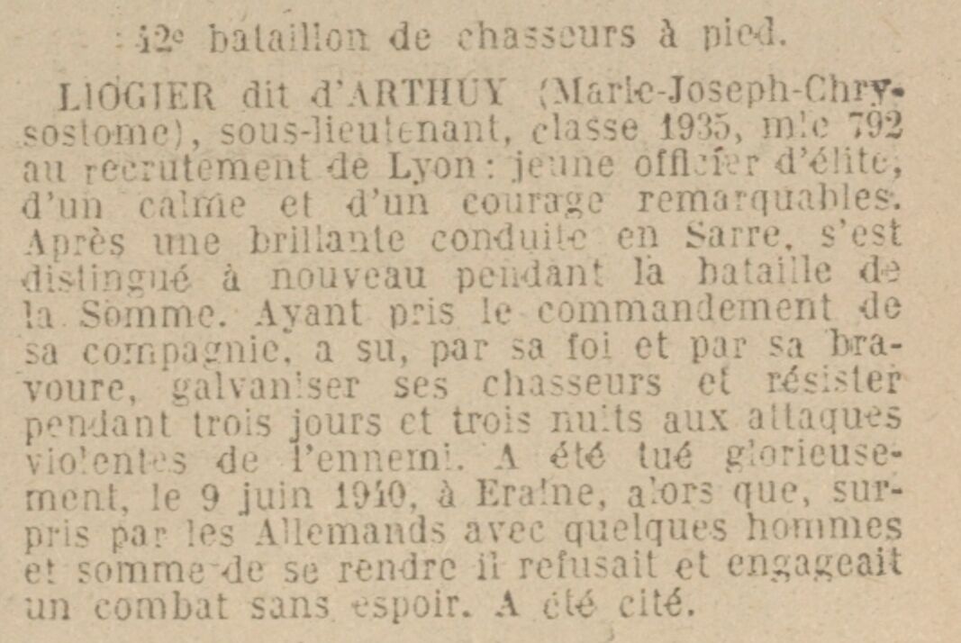 Bernard Joseph Alphonse PINEGRE Mort pour la France le 7 juin 1940 à Erches (Somme) Né le 18 février 1911 à Vregille (Saône-et-Loire) 42e bataillon de chasseurs à pied (42e BCP) Mort pour la France Sources : Service historique de la Défense, Caen Cote : AC 21 P 130027
