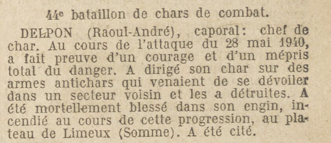 DELPON (Raoul-André), caporal : chef de char. Au cours de l'attaque du 28 mai 1940, a fait preuve d'un courage et d'un mépris total du danger. A dirigé son char sur des armes antichars qui venaient de se dévoiler dans un secteur voisin et les a détruites. A été mortellement blessé dans son engin, incendié au cours de cette progression, au plateau de Limeux (Somme). A été cité.