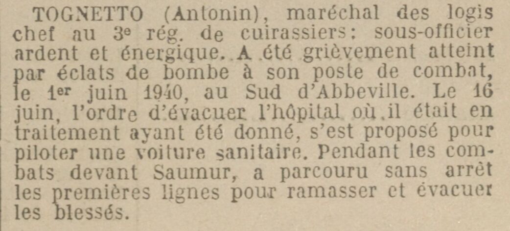 TOGNETTO (Antonin), maréchal des logis chef au 3e régiment de cuirassiers : sous-officier ardent et énergique, A été grièvement atteint par éclats de bombe à son poste de combat, le 1er juin 1940, au Sud d'Abbeville. Le 16 juin, l'ordre d'évacuer l'hôpital, où il était en traitement ayant été donné, s'est proposé pour piloter une voiture sanitaire. Pendant les combats devant Saumur, a parcouru sans arrêt les premières lignes pour ramasser et évacuer les blessés.