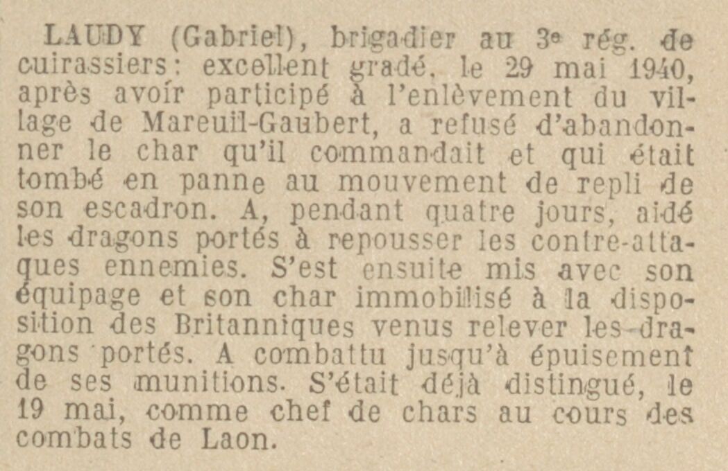 LAUDY (Gabriel), brigadier au 3e régiment de cuirassiers : excellent gradé, le 29 mai 1940, après avoir participé à l'enlèvement du village de Mareuil-Caubert, a refusé d'abandonner le char qu'il commandait et qui était tombé en panne au mouvement de repli de son escadron. A, pendant quatre jours, aidé les dragons portés à repousser les contre-attaques ennemies. S'est ensuite mis avec son équipage et son char immobilisé à la disposition des Britanniques venus relever les dragons portés. A combattu jusqu'à épuisement de ses munitions. S'était déjà distingué, le 19 mai, comme chef de char au cours des combats de Laon.