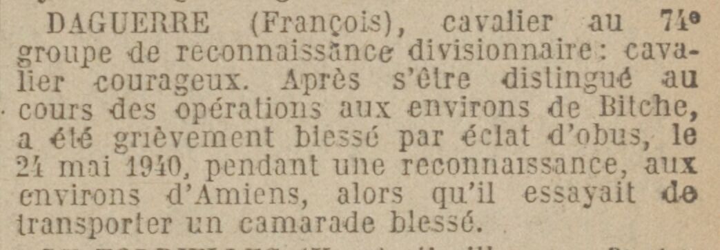 FOURCADE (Pierre-Jean-Norbert), cavalier, matricule 364 : cavalier intelligent et courageux ayant participé brillamment à plusieurs engagement en faisant preuve d'esprit d'abnégation et de devoir. A été tué lors d'un bombardement, le 24 mai 1940, à Cachy (Somme). Croix de guerre avec palme.