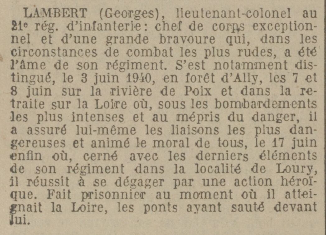 21e régiment d'infanterie J.O. du 18 août 1943 page 2177 Nomination dans la Légion d'Honneur à titre posthume