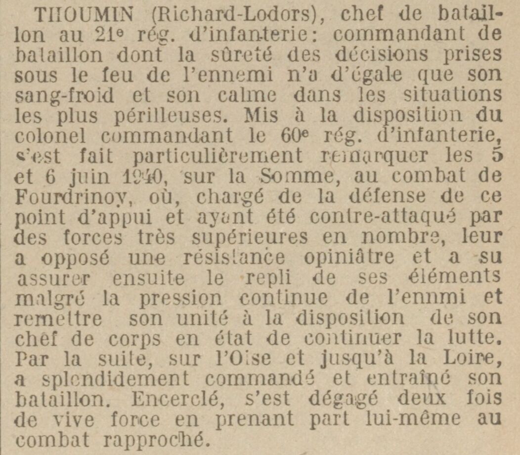 MOREAU (René), capitaine : jeune capitaine d'un courage et d'un allant remarquables. A trouvé une mort glorieuse, le 29 mai 1940, à l'Est des bois de Guignemicourt, en se portant sous un violent bombardement, à l'aide d'une de ses sections en danger. A été cité.