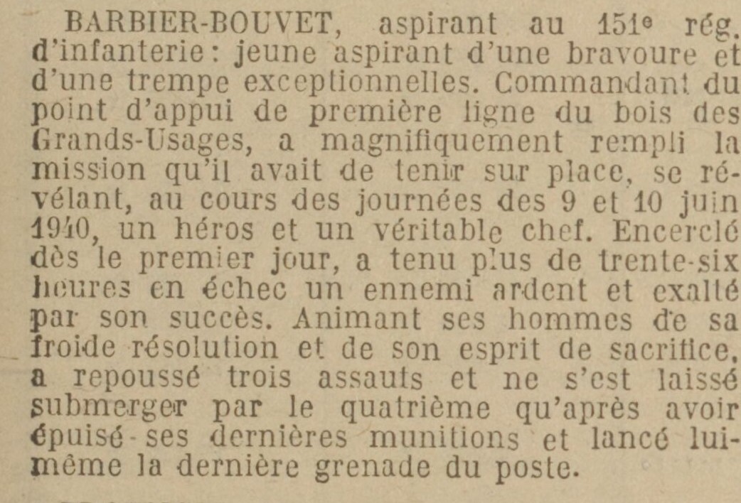 BARBIER-BOUVET, aspirant au 151e régiment d'infanterie : jeune aspirant d'une bravoure et d'une trempe exceptionnelles. Commandant du point d'appui de première ligne du bois des Grands-Usages*, a magnifiquement rempli la mission qu'il avait de tenir sur place, se révélant, au cours des journées des 9 et 10 juin 1940, un héros et un véritable chef. Encerclé dès le premier jour, a tenu plus de trente-six heures en échec un ennemi ardent et exalté par son succès. Animant ses hommes de sa froide résolution et de son esprit de sacrifice, a repoussé trois assauts et ne s'est laissé submerger par le quatrième qu'après avoir épuisé ses dernières munitions et lancé lui-même la dernière grenade du poste.