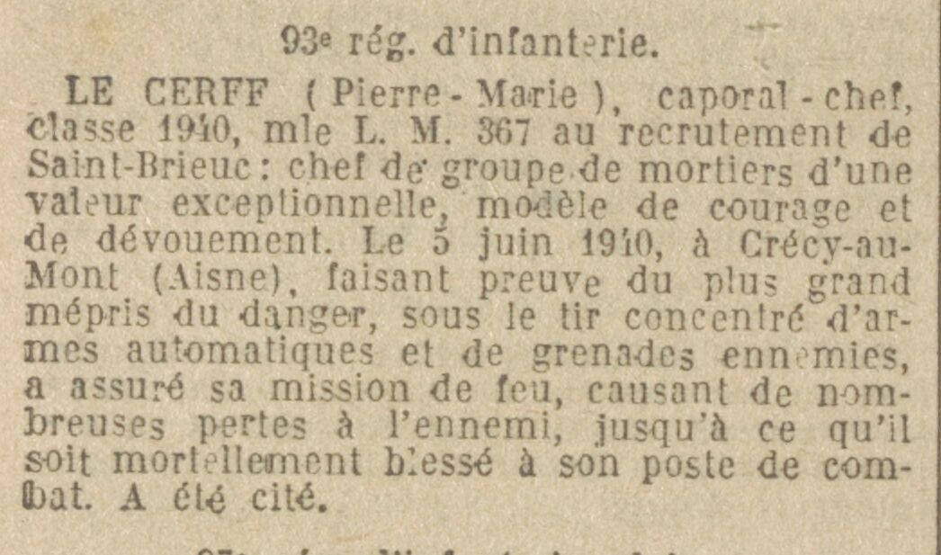LE CERFF (Pierre-Marie), caporal-chef, classe 1940, matricule L. M. 367 au recrutement de Saint-Brieuc : chef de groupe de mortiers d'une valeur exceptionnelle, modèle de courage et de dévouement. Le 5 juin 1940, à Crécy-au-Mont (Aisne), faisant preuve du plus grand mépris du danger, sous le tir concentré d'armes automatiques et de grenades ennemies, a assuré sa mission de feu, causant de nombreuses pertes à l'ennemi, jusqu'à ce qu'il soit mortellement blessé à son poste de combat. A été cité.