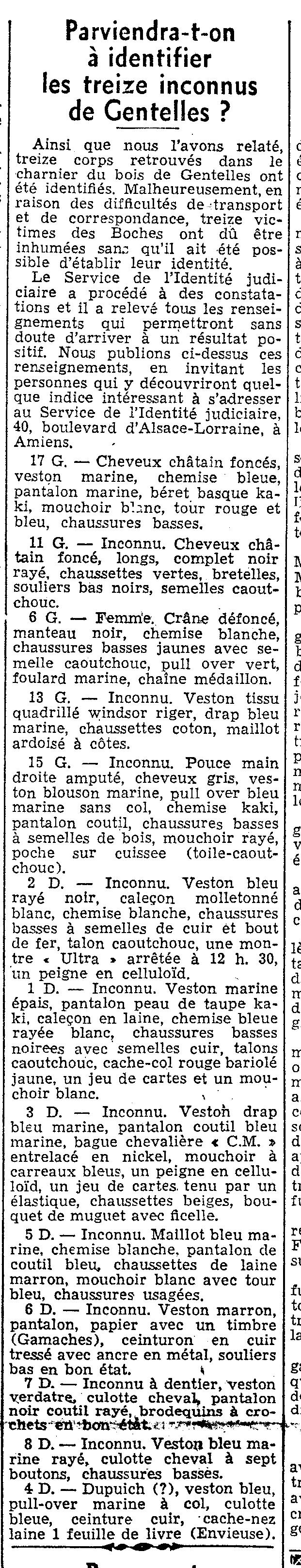 Le nombre des identifications concernant les victimes de Gentelles est donc maintenant de 12. Les indications relevées par le service de l'Identité Judiciaire (40, Boulevard d'Alsace-Lorraine) permettront saans doute d'identifier d'autres corps